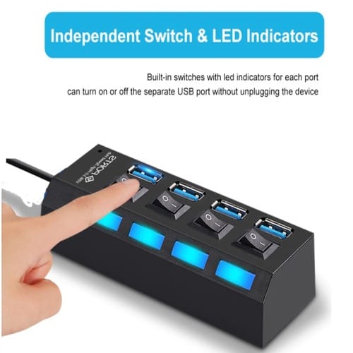 *(Extensor USB 4 Puertos con Botones de Encendido Individuales + Luz LED – Incluye Cable y Adaptador de Poder – Ideal para Oficina, Gaming y Hogar)*